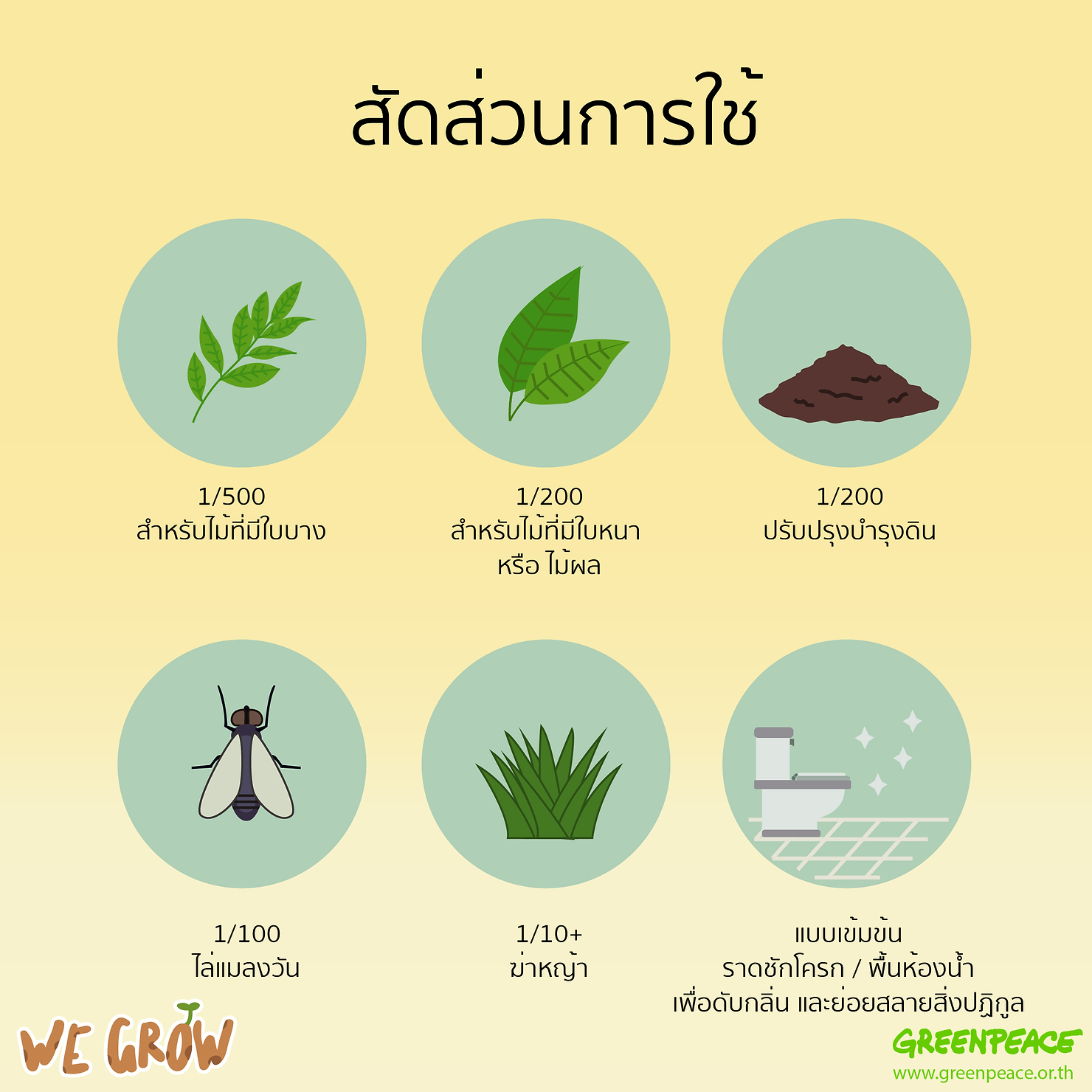 1/100 : ไล่แมลงวัน 1/10 + เกลือ : ฆ่าหญ้า